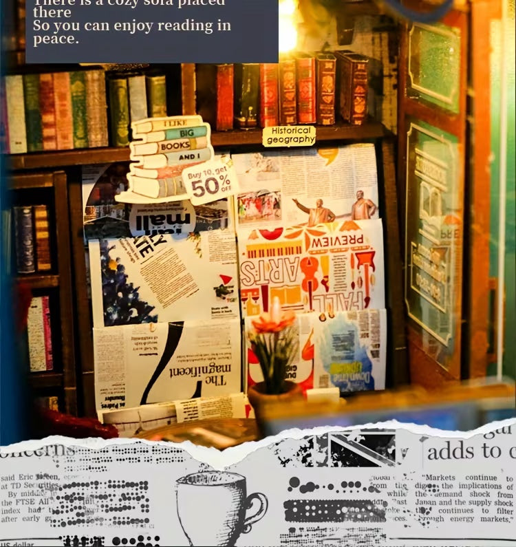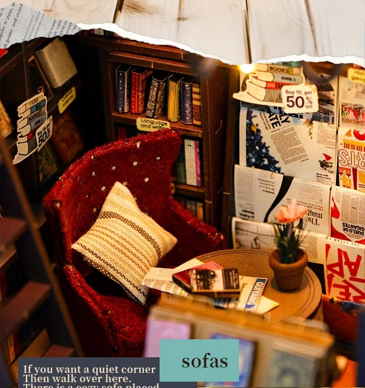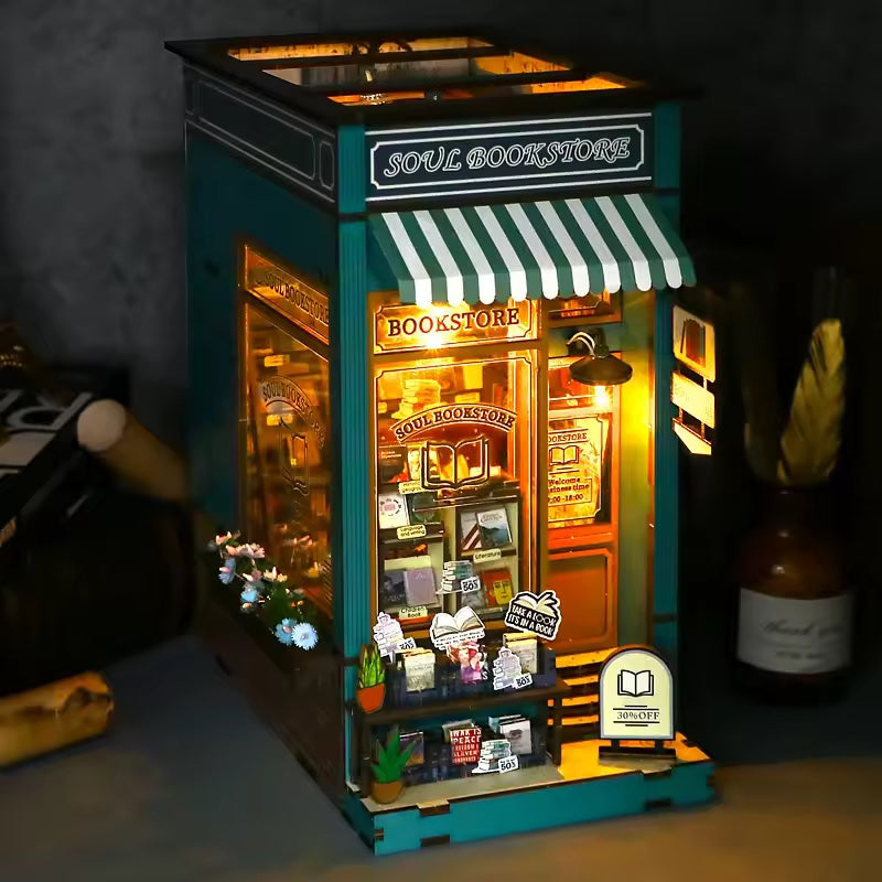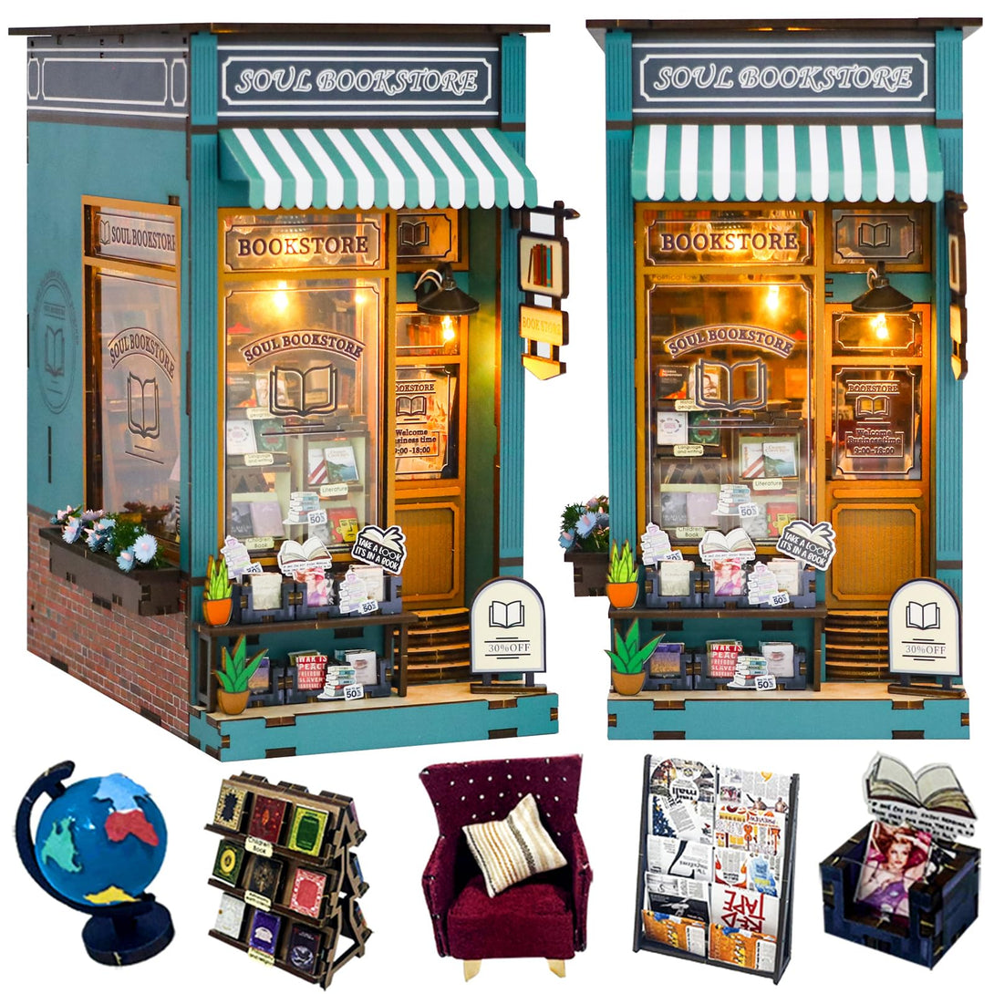 CRIOLPO DIY Book Nook Kit, Miniature House Model, Charming Bookshelf Scene, Wooden Dolls House, Bookshelf Miniature Scenes, for Hobbyists and Decor - Soul Bookstore