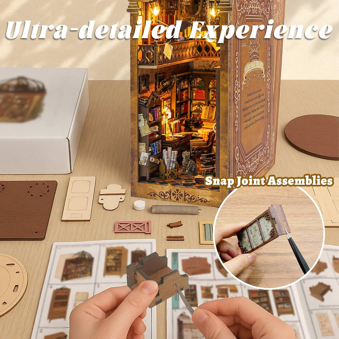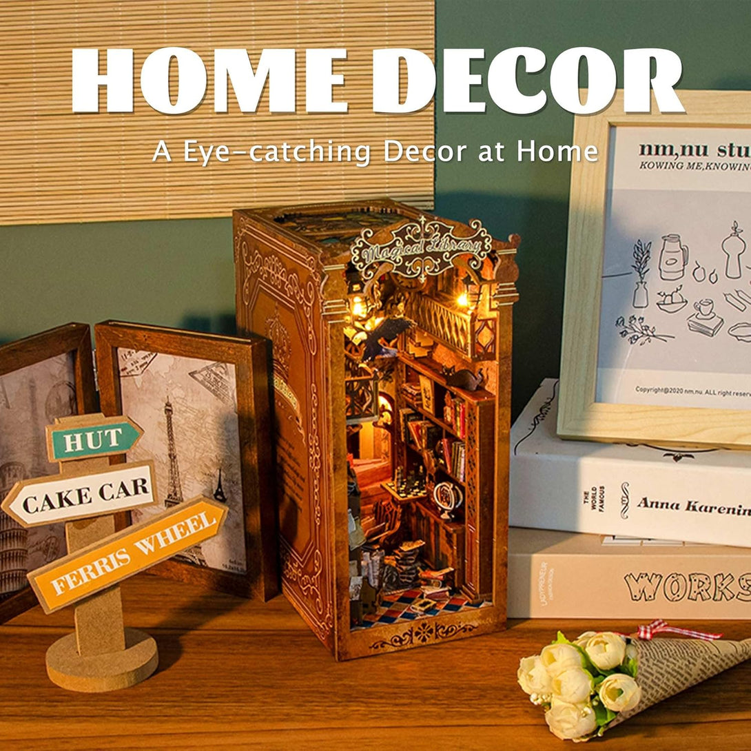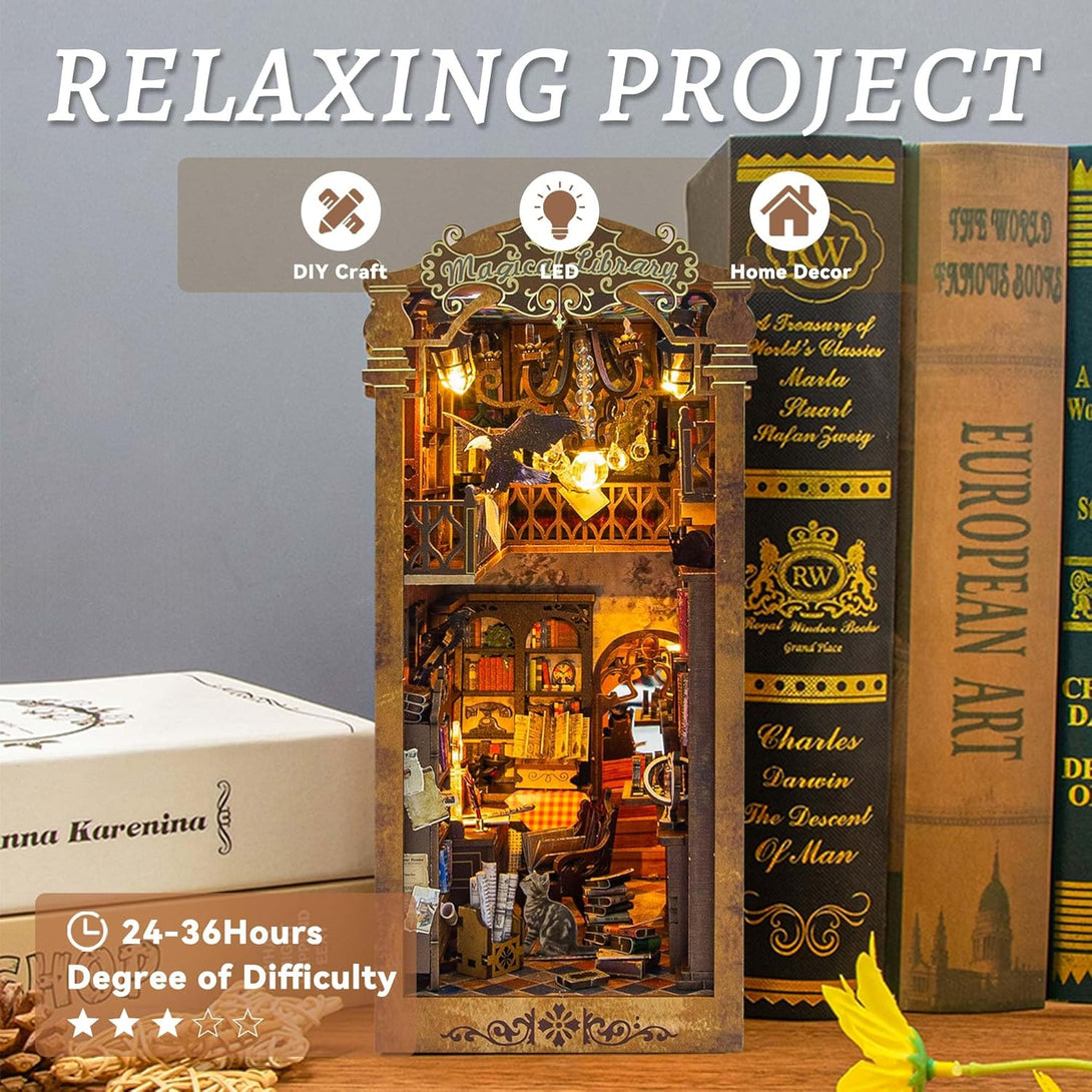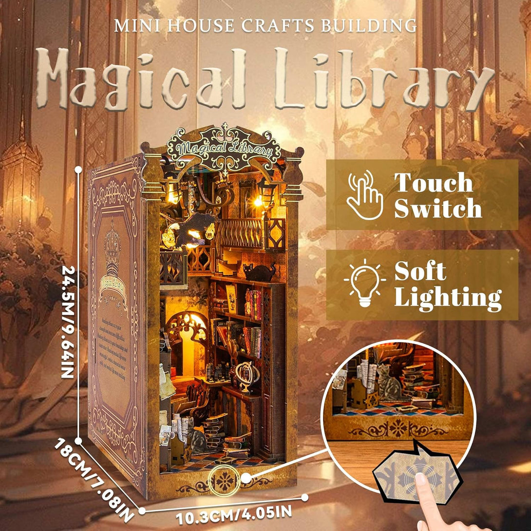 CRIOLPO DIY Book Nook Miniature Kit, DIY Booknook Bookshelf Insert Decor, 3D Wooden Booknook Miniature Kit for Creative Assembled Bookends(Magical Library)