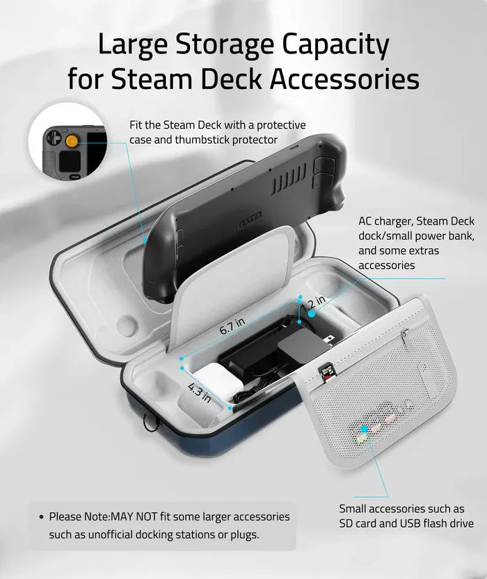 Overview The Hard Protective Case for Steam Deck is easy to store, travel, and carry. The large bottom compartment features organized storage and a zippered mesh pocket. The ultralight and sleek...